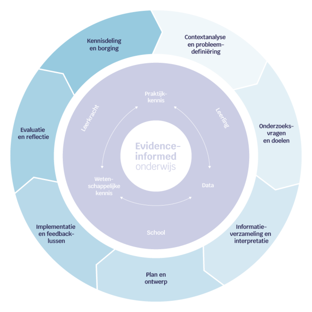 Bij procesmatig evidence-informed werken worden zeven fasen onderscheiden. Deze fasen hoef je niet lineair te doorlopen: het is normaal dat je heen en weer beweegt tussen fasen (omdat nieuwe informatie of inzichten, je bijvoorbeeld leidt naar een betere afbakening van de onderwijsbehoefte), dat je fasen samenneemt of net uitsplitst.